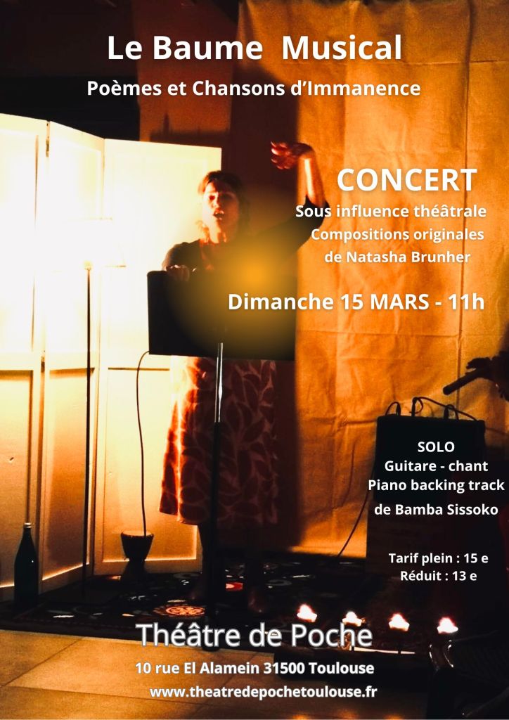 Natasha Brunher accompagne ses mélodies et poèmes slam à la guitare, certaines avec le piano backing-track de son comparse Bamba Sissoko.Elle partage avec nous une synthèse d’expériences personnelles et sociétales dans lesquelles Amour et humour s’invitent.
