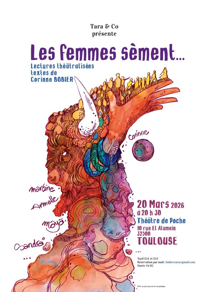 Un voyage poétique et dynamique par ses lectures simples ou théâtralisées où tous les sujets sont abordés sans tabou sur nos vies de Femmes. Au fil des représentations l’auteure et lectrice Corinne Bobier aime à inviter des Femmes à traverser ce spectacle saupoudré de voyages sonores.