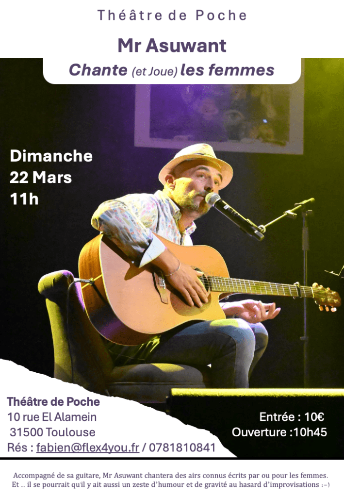 Mr Asuwant chante (et joue…) les femmes, accompagné de sa guitare, il chantera des airs connus écrits par ou pour les femmes.